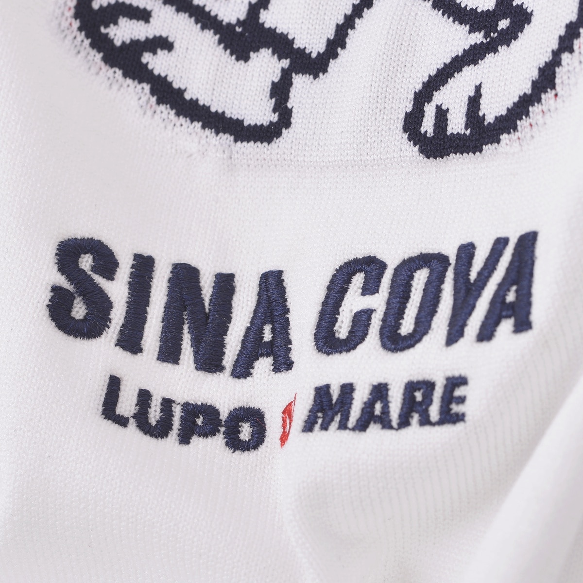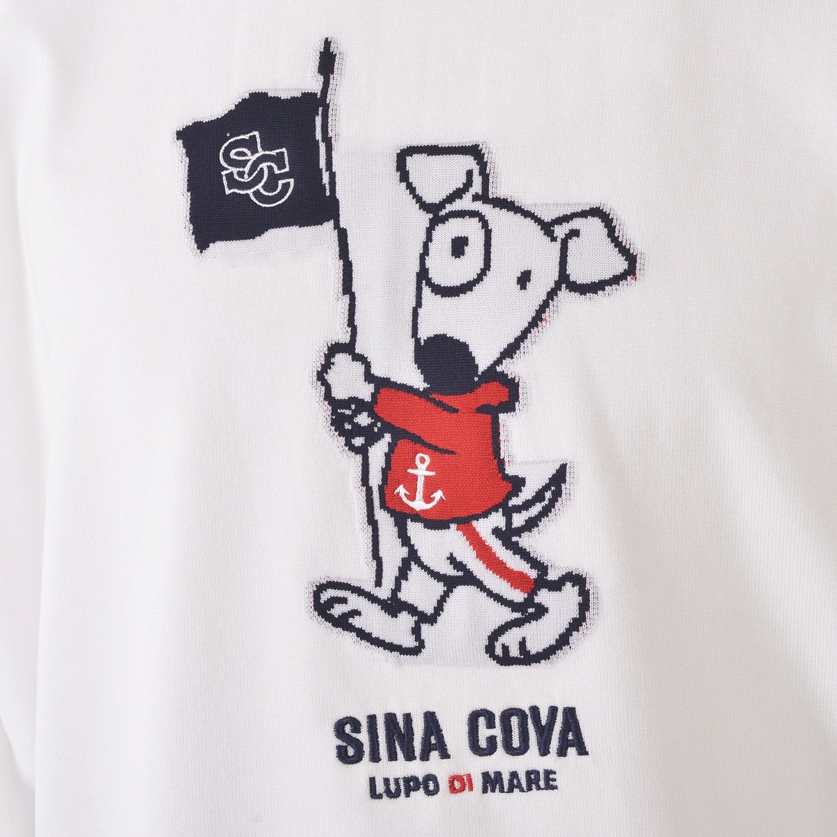 身頃には14Gゲージの部分ジャガード編みを施し、UTILITA犬がキャディーに扮する遊び心あるデザインを表現。