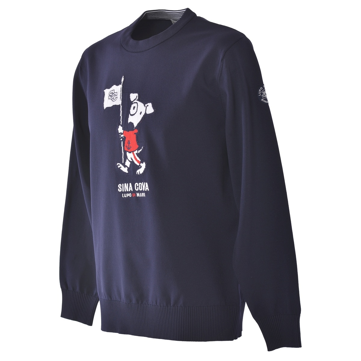 身頃には14Gゲージの部分ジャガード編みを施し、UTILITA犬がキャディーに扮する遊び心あるデザインを表現。