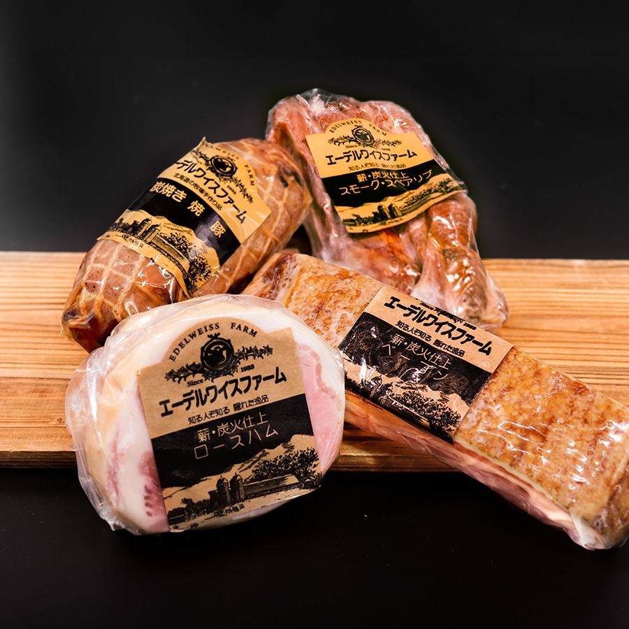 ★ロースハム(200g)×1 ★ベーコンブロック(280g)×1 ★焼豚(280g)×1 ★スモークスペアリブ(280g)×1