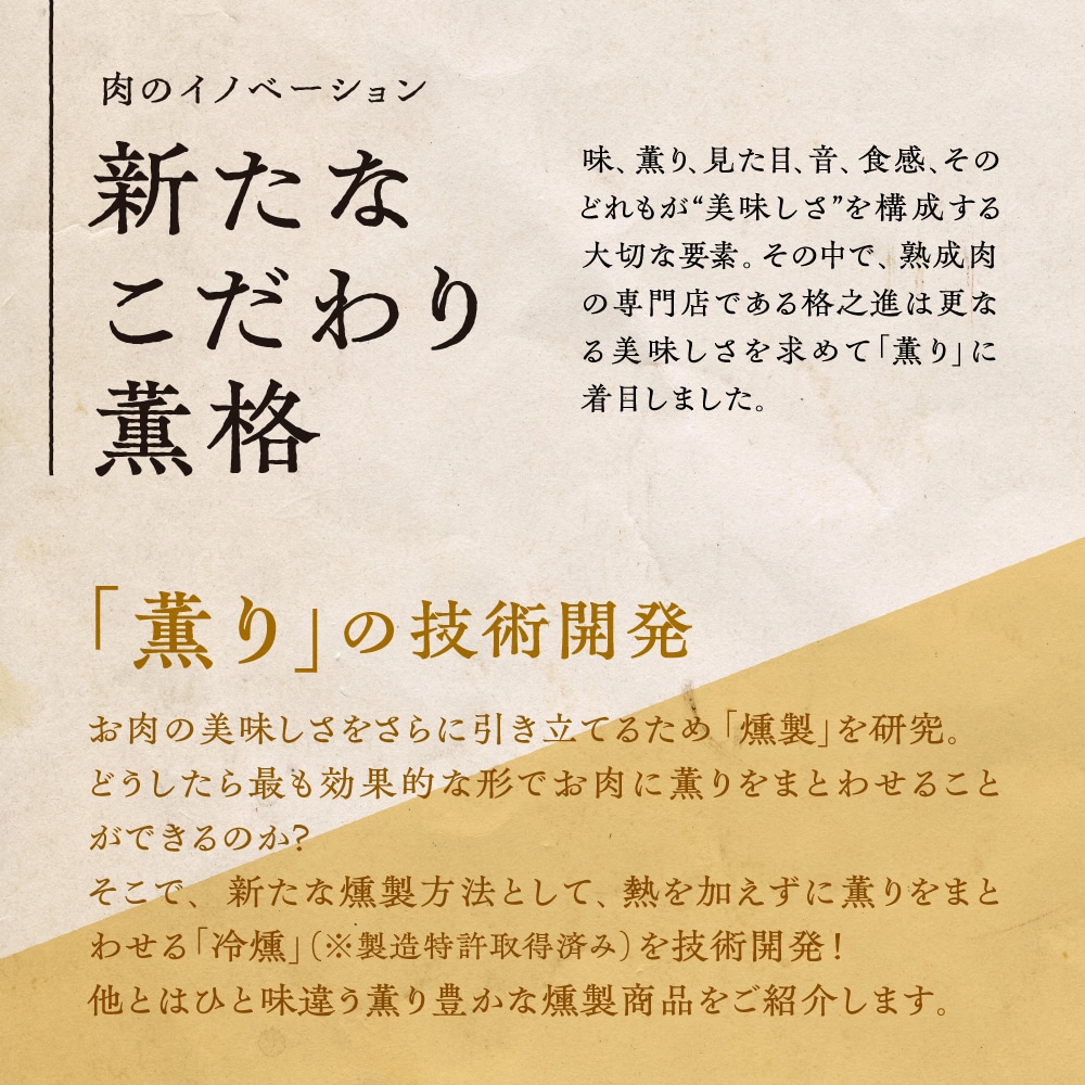 この「金格ハンバーグ」に冷凍のまま燻製するという新しい技術(冷燻)によって「薫り」という付加価値をプラスし、さらなる高みへとグレードアップしたハンバーグです。