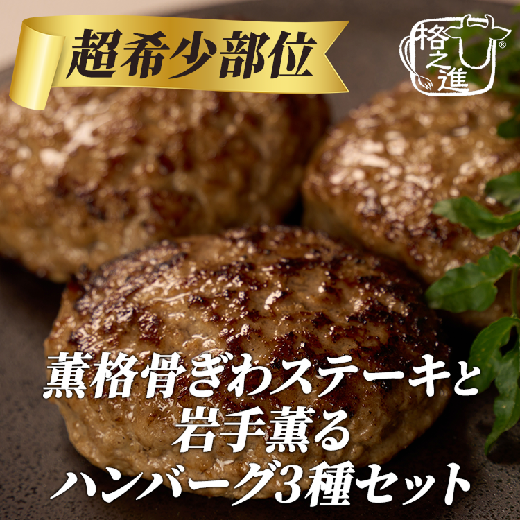 格之進の黄金ブレンドによって生まれた上品で甘味のある奥深い味わいが特徴の「金格ハンバーグ」、岩手のチップで冷凍燻製(弊社製造特許取得済)を掛けた薫り深い「薫格ハンバーグ」、黒毛和牛から創り出した調味料“牛醤(商標登録済み)”を練り込んだ「牛醤ハンバーグ」の3種ハンバーグを詰め合わせました。