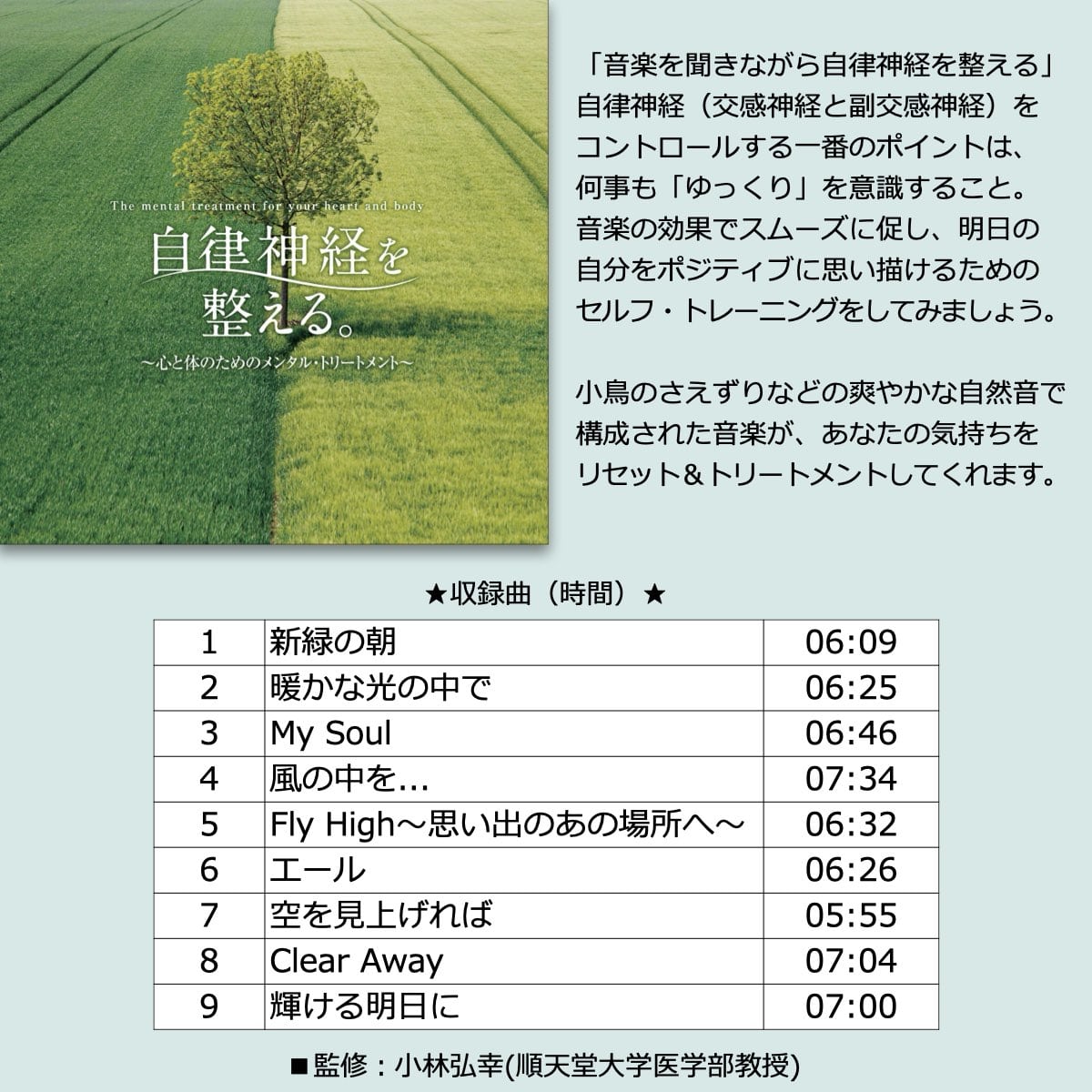 ※曲順 01-07はアルバム「自律神経にやさしい音楽」、曲順08-16はアルバム「自律神経を整える。-心と体のためのメンタル・トリートメント」、曲順17-24はアルバム「自律神経を整える-やすらぎの時間へと誘う音楽」に、それぞれ収録されている曲となります。