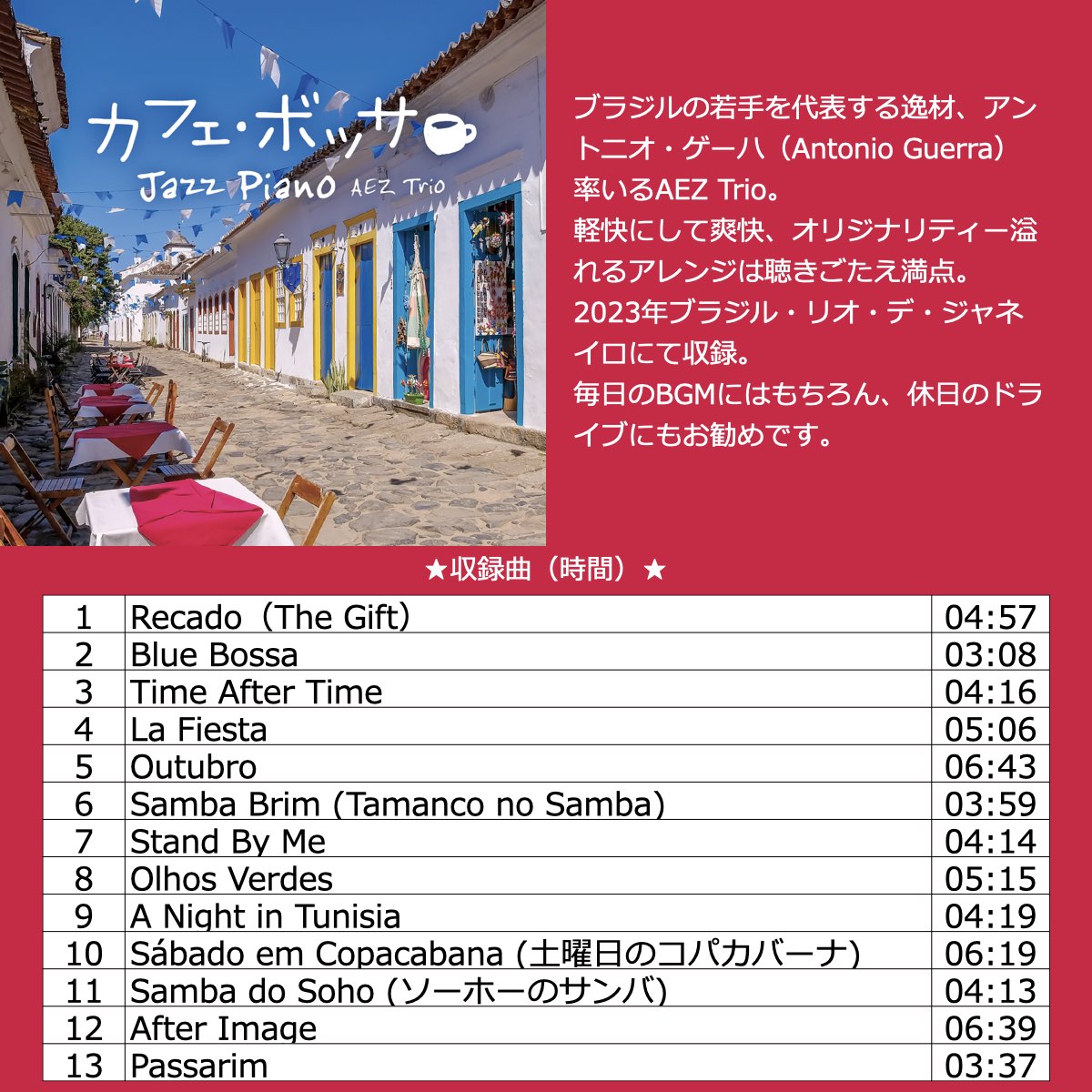 ※曲順 01-13はアルバム「カフェ・ボッサ -ジャズ・ピアノ」、曲順14-28はアルバム「カフェ・ボッサ -ジャズ・ギター」、曲順29-43はアルバム「カフェ・ボッサ -クラシック」に、それぞれ収録されている曲となります。