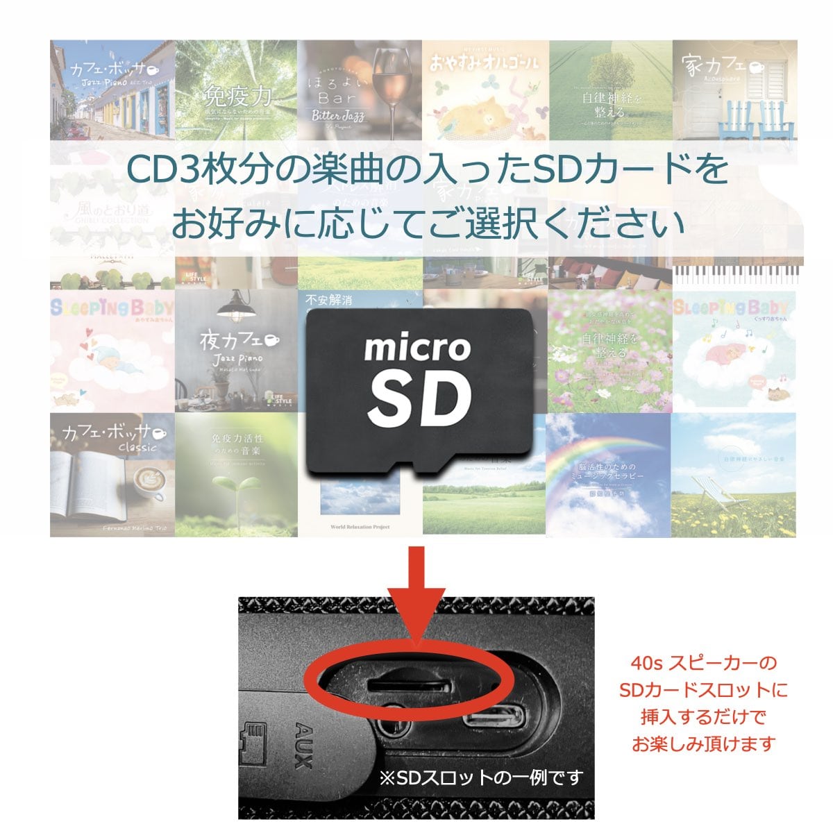 CD複数枚分に相当する高品質な音楽データが1枚のSDカードに収納されています。スピーカーのSD再生機能は、ループ再生やランダム再生に対応しており、SDカード内の音楽が停止することなく、ずっと繰り返し再生することが可能です。ストリーミングなどのサブスク契約が不要のBGMとしてご利用頂けるお得なセットです。