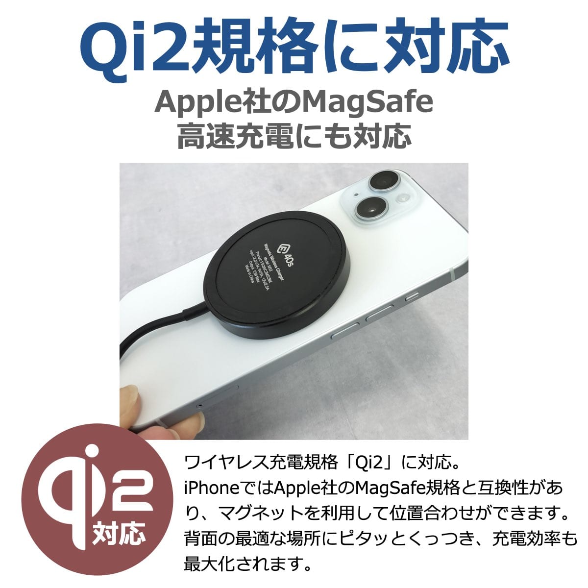 次世代ワイヤレス充電器規格 Qi2規格に準拠。iPhoneのMagSafe規格とも互換性があり、Qi搭載のAndroid端末も充電可能。USB-PDに対応し最大15Wの高速充電が可能です。