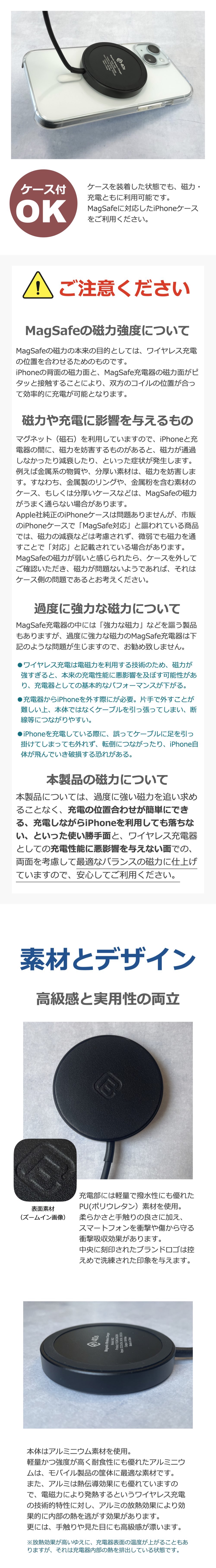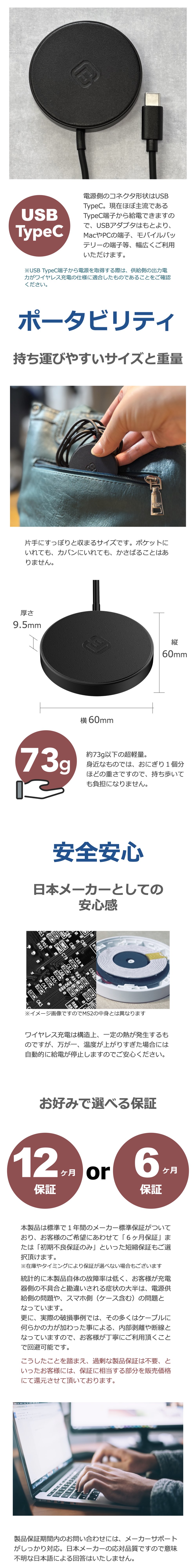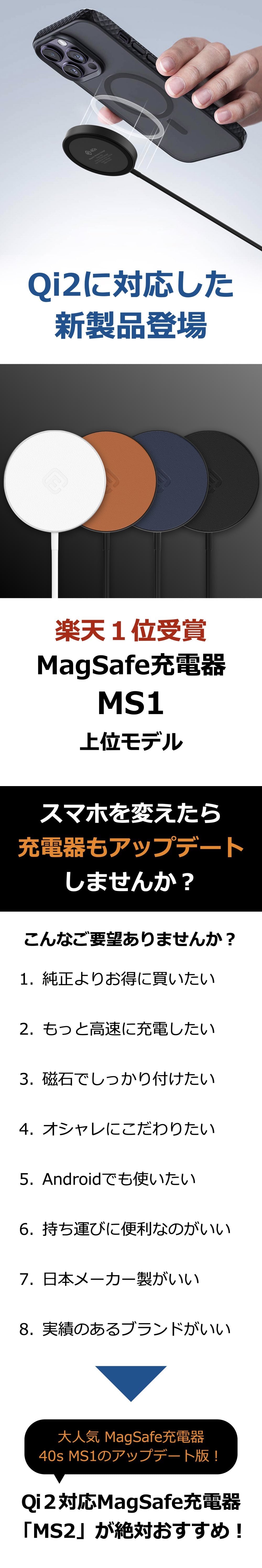 ・Qi2 MagSafe対応機種: iPhone 17, iPhone 17e, iPhone17 Pro, iPhone17 Pro Max, iPhone Air, iPhone16, iPhone 16 Plus, iPhone16 Pro, iPhone16 ProMax, iPhone15, iPhone 15 Plus, iPhone15 Pro, iPhone15 ProMax, iPhone14, iPhone 14plus, iPhone 14 Pro, iPhone14 ProMax, iPhone13, iPhone 13mini, iPhone 13 Pro, iPhone13 Pro Max, iPhone12, iPhone 12 mini, iPhone12 Pro, iPhone 12 Pro Max ・ Qi ワイヤレス充電 対応機種: iPhone(アイフォン): iPhone16e, iPhoneSE3(第3世代), iPhoneSE2(第2世代), iPhone11, iPhone 11Pro, iPhone11 Pro Max, iPhoneXS iPhone XS Max, iPhoneXR, iPhoneX, iPhone8, iPhone 8 Plus ・ Android (アンドロイド): Qi2に対応したAndroidスマートフォン ※上記に限らず、Qi規格対応と表示のあるスマホ、置くだけ充電 対応の各端末、イヤホンやウオッチ等の小物機器等、Qiワイヤレス充電の標準規格による充電仕様に対応した、スマートフォン、タブレット、ガジェットの充電に対応しますが、全ての機器に動作保証するものではありません。 ※Qi2及びMagSafe(磁力+充電)は端末自体に機能として組み込まれた製品が動作保証対象となります。未対応の端末にシールやケース等の外部パーツを用いてQi2やMagSafe対応として独自改良・加工されたものは保証対象外となります。お客様自身のご判断でご利用ください。 |