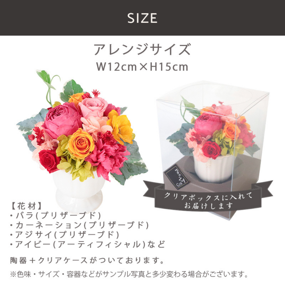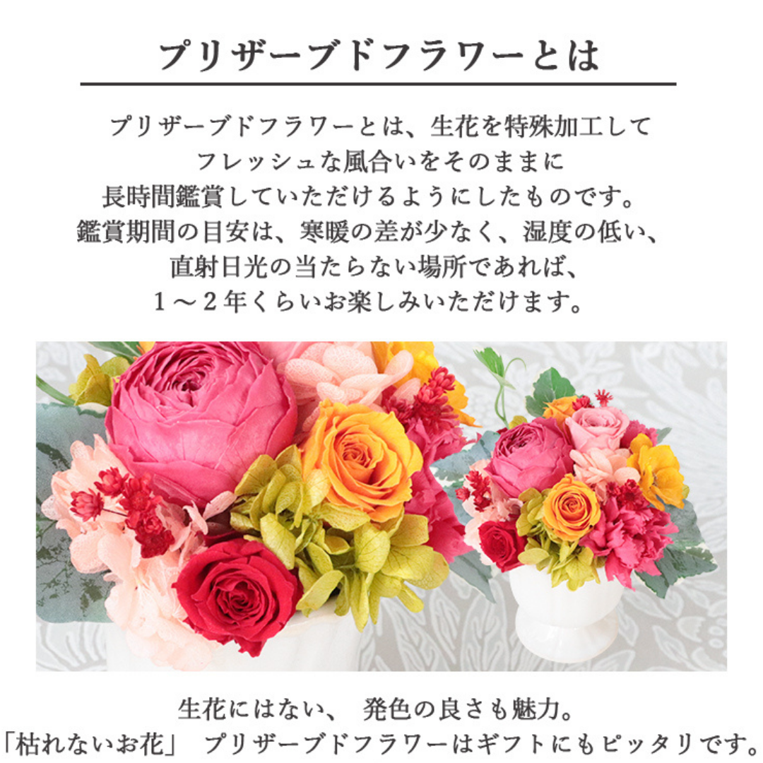 1~2年くらいお楽しみいただけます。生花にはない、発色の良さも魅力。「枯れないお花」プリザーブドフラワーはギフトにもピッタリです。※取扱い説明書もお付けいたしております。