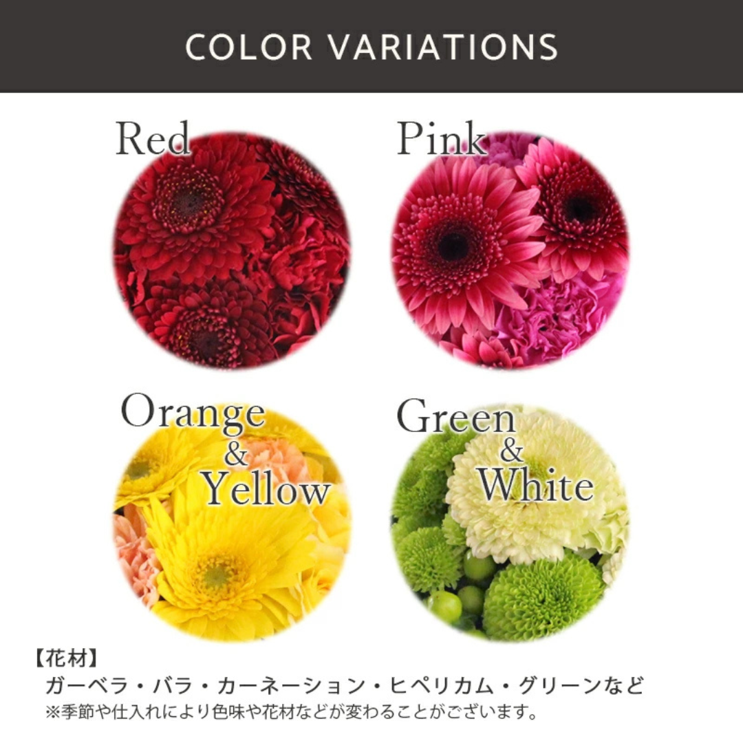 ◆夏期(7/1-9/30)は、北海道・青森県、九州地方・沖縄県、中国・四国地方、離島のお届けについてはお近くのネットワークショップより直接お届けいたします。その際、サンプルに似せてお作りいたしますが形状・ボリューム等が異なることをご了承ください。また、花の仕入れ状況により色指定を受けられない場合もございます。