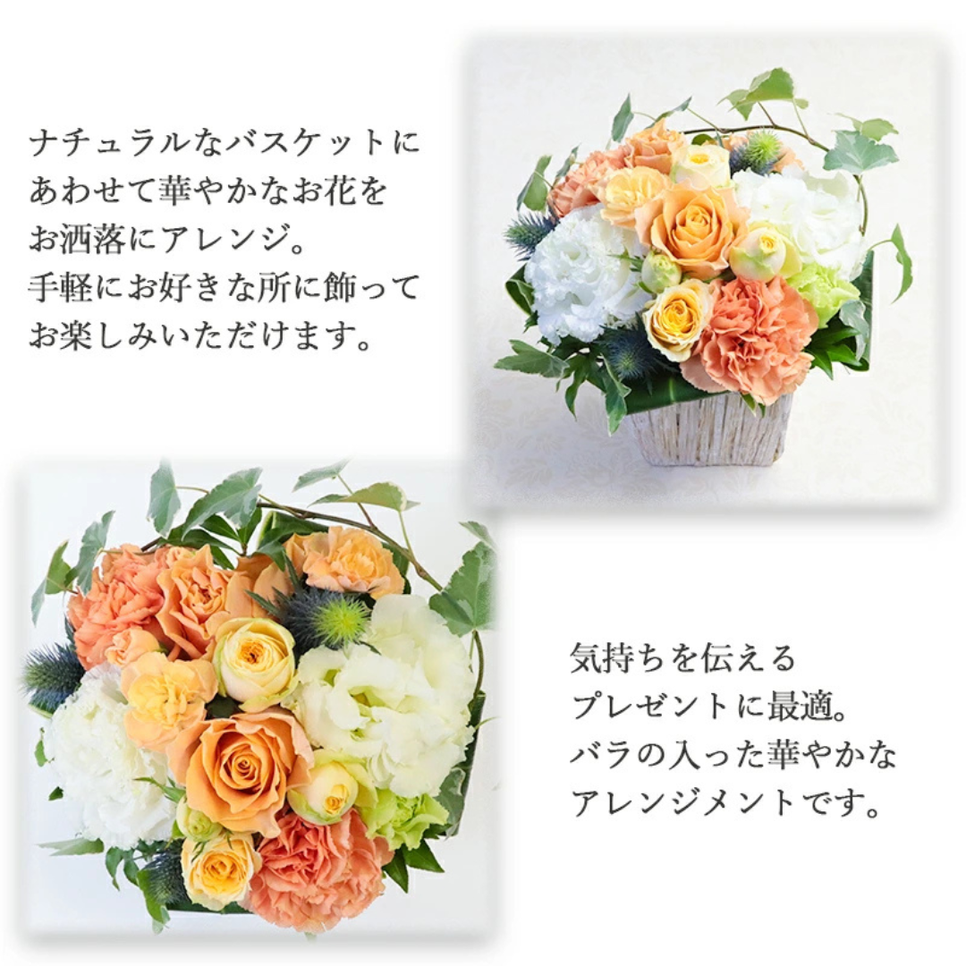 花瓶がなくてもそのまま飾っていただけるバスケットタイプのアレンジメントです。 華やかなシーンをさらに引き立てます。