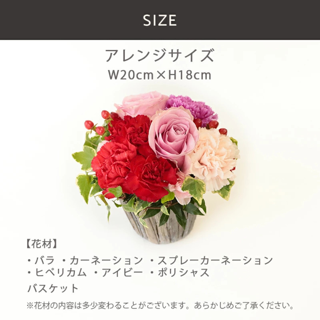 ・バラ・カーネーション・スプレーカーネーション ・ヒペリカム・アイビー・ポリシャス 【バスケット】