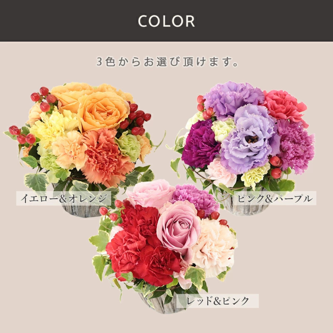 華やかな姿が魅力的なフランス語でグッドラックという意味の「ボンヌ・シャンス』。 3色をご用意致しました。 お母様のイメージに合わせてお選びいただけます。