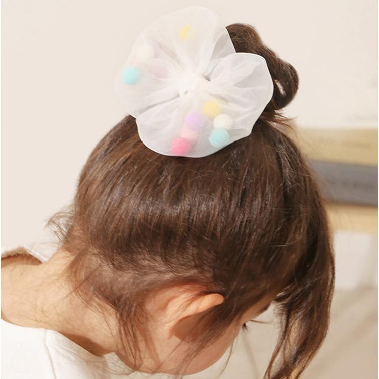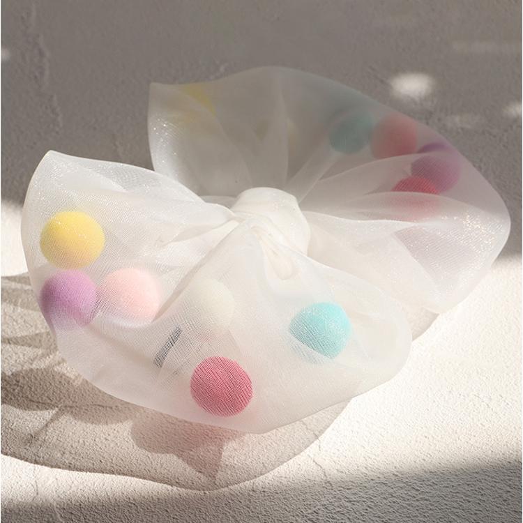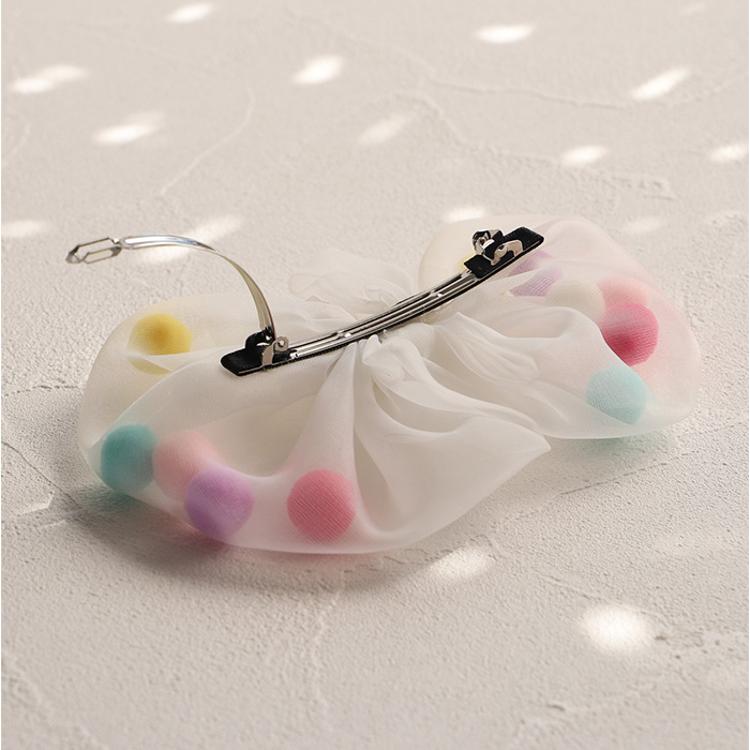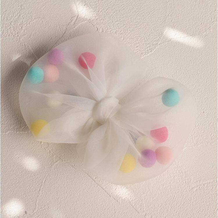 ・オーガンジーのように透け感のある生地で作られたリボン。カラフルなポンポンをIN♪