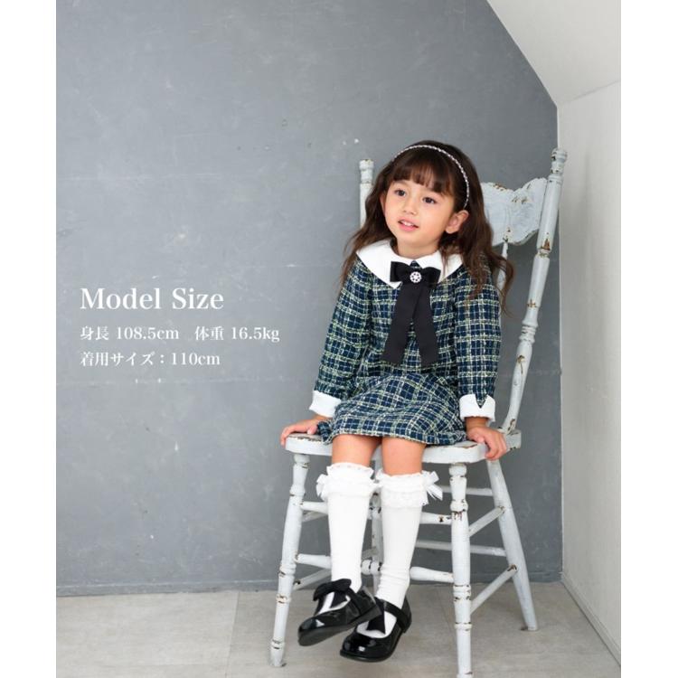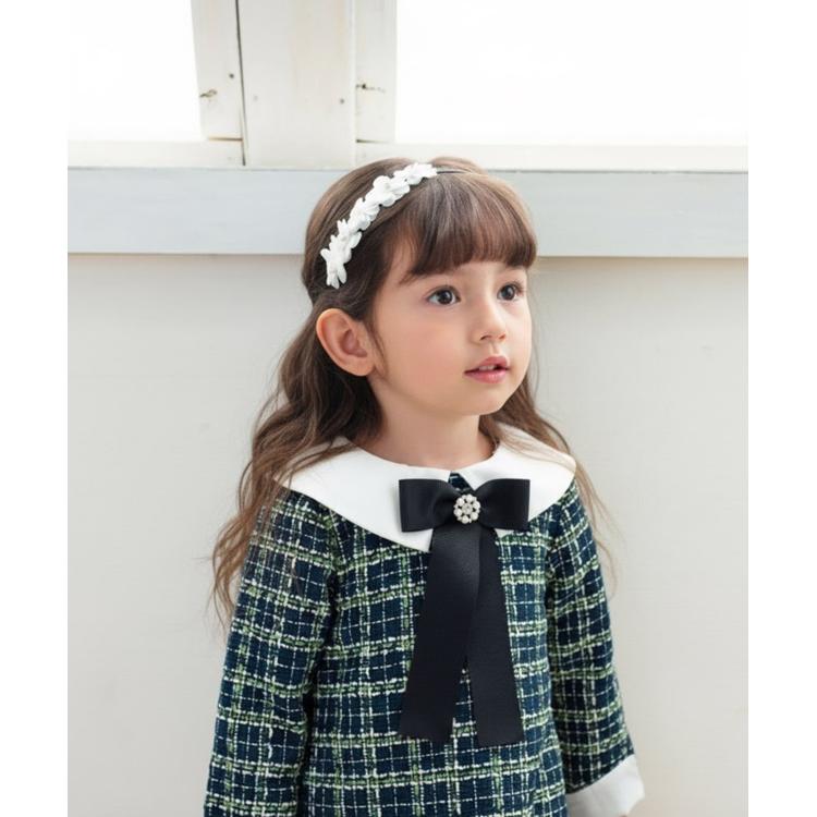 ・シンプルながらも、黒のリボンとパールのブローチが首元にきちんとした印象を与え、可愛さと大人っぽさを兼ね備えています。
