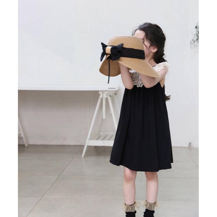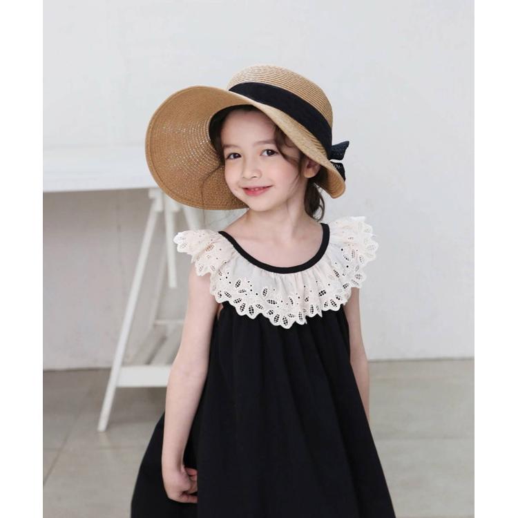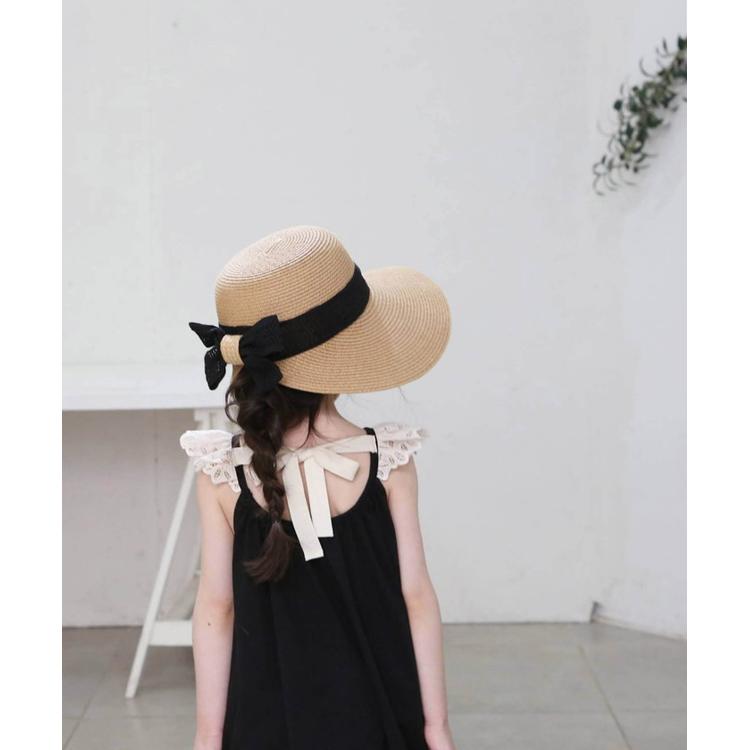 ・通気性のよい麦わら帽子を、濃い茶色×ブラックで大人っぽく、裏ひもでサイズ調整ができてママも一緒に使えるように完成しました!