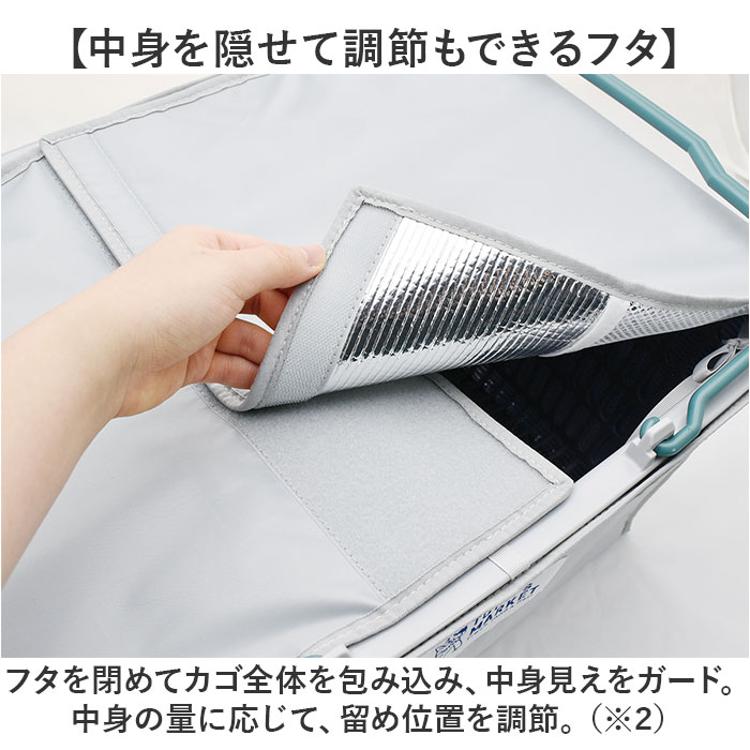 ・フタを閉めてカゴ全体を包み込み、中身見えをガード。中身の量に応じて、留め位置を調節。