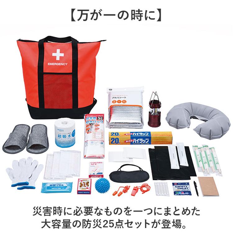 ・災害時に必要なものを一つにまとめた大容量の防災25点セットが登場。