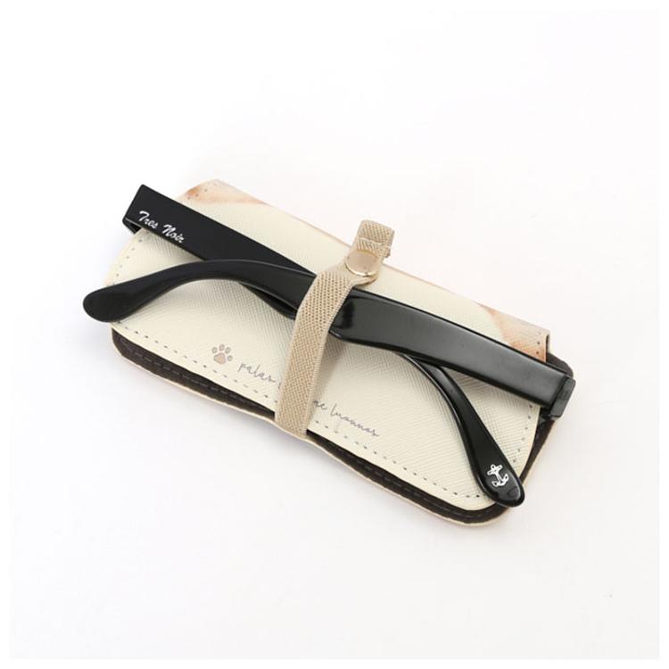 ・メガネのテンプル(つる)は、持ち運び中に開いてしまわないよう、スナップボタン付きバンドでしっかりと固定。