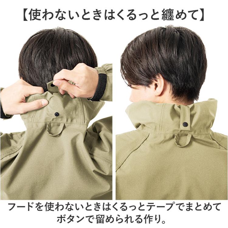 ・フードを使わないときはくるっとテープでまとめてボタンで留められる作り。