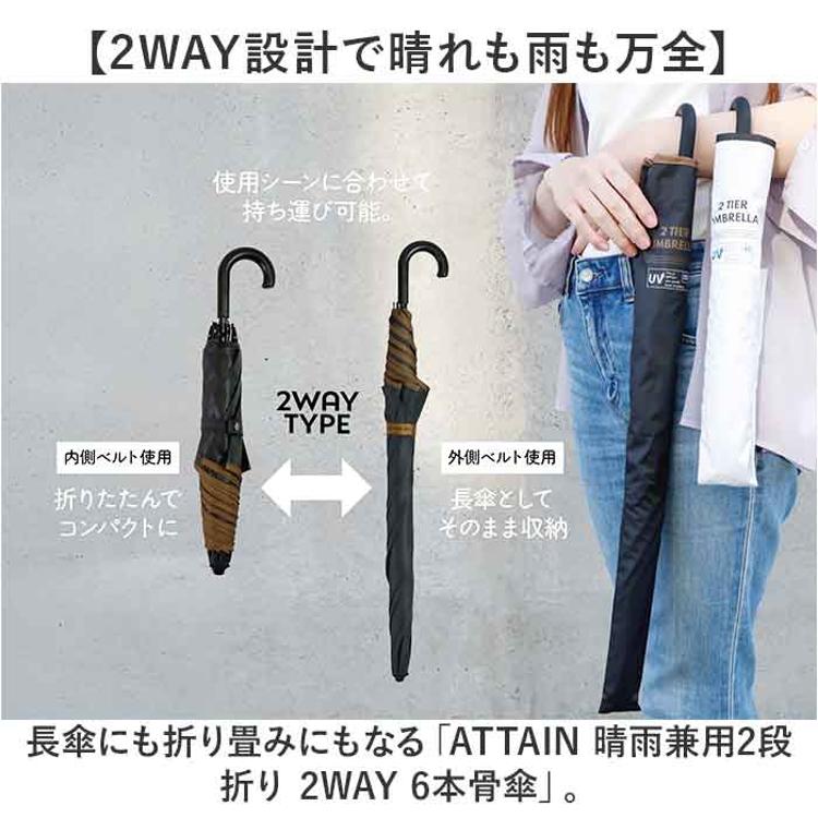 ・長傘にも折り畳みにもなる「ATTAIN 晴雨兼用2段折り 2WAY 6本骨傘」。