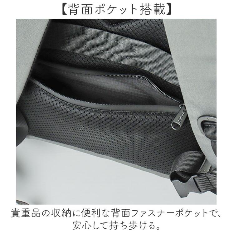・貴重品の収納に便利な背面ファスナーポケットで、安心して持ち歩ける。