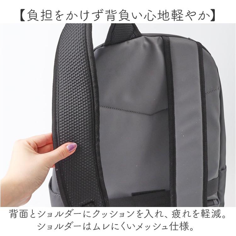 ・背面とショルダーにクッションを入れ、疲れを軽減。ショルダーはムレにくいメッシュ仕様。