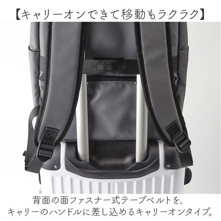 ・背面の面ファスナー式テープベルトを、キャリーのハンドルに差し込めるキャリーオンタイプ。