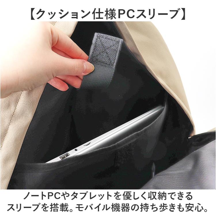 ・ノートPCやタブレットを優しく収納できるスリーブを搭載。モバイル機器の持ち歩きも安心。