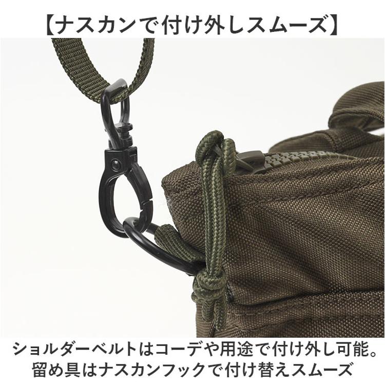 ・ショルダーベルトはコーデや用途で付け外し可能。留め具はナスカンフックで付け替えスムーズ