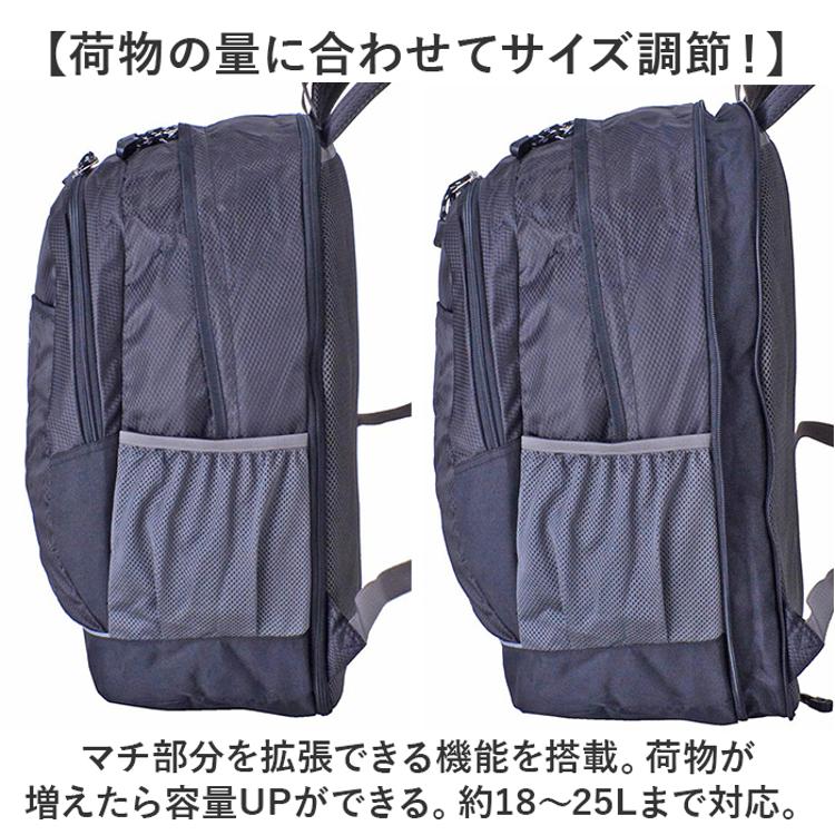 ・マチ部分を拡張できる機能を搭載。荷物が増えたら容量UPができる。約18~25Lまで対応。