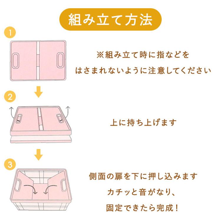 ・折りたたまれた状態のキャラコンテナ両サイドのスリットに指を入れてフレームを持ち上げ、サイドパネルを下に向けて押し込むだけ!カチッと音が鳴って固定できたら完成!