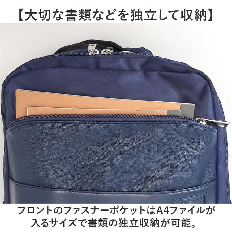 ・フロントのファスナーポケットはA4ファイルが入るサイズで書類の独立収納が可能。