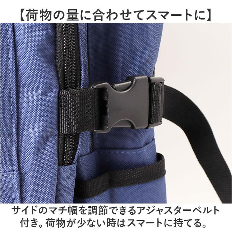 ・サイドのマチ幅を調節できるアジャスターベルト付き。荷物が少ない時はスマートに持てる。