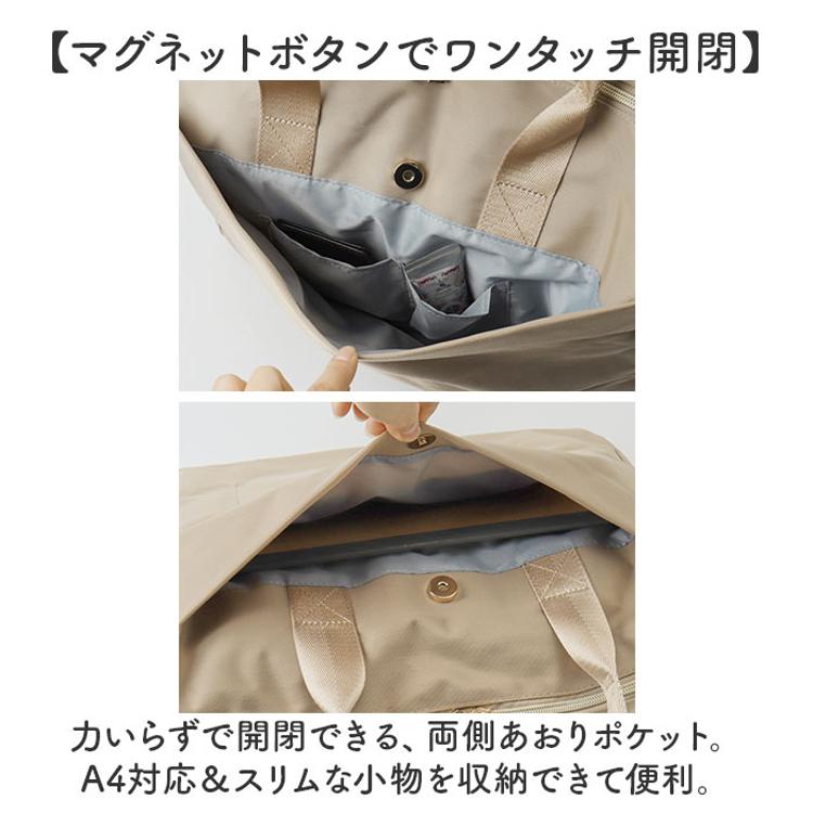 ・しっかり入る舟形タイプ。手提げで持つ際は、スナップボタンベルトを留めてボストンに変形。