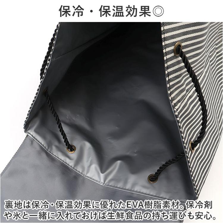 ・裏地は保冷・保温効果に優れたEVA樹脂素材。保冷剤や氷と一緒に入れておけば生鮮食品の持ち運びも安心。