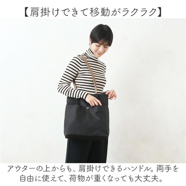 ・アウターの上からも、肩掛けできるハンドル。両手を自由に使えて、荷物が重くなっても大丈夫。