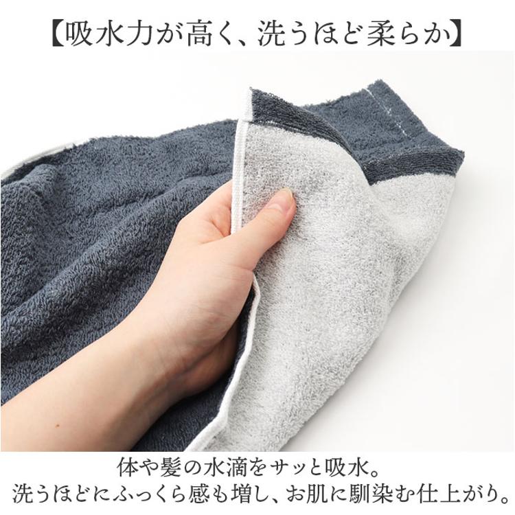 ・体や髪の水滴をサッと吸水。洗うほどにふっくら感も増し、お肌に馴染む仕上がり。