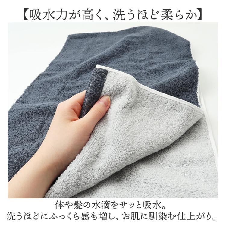 ・体や髪の水滴をサッと吸水。洗うほどにふっくら感も増し、お肌に馴染む仕上がり。