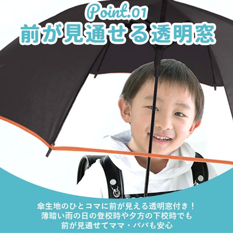 ・傘生地のひとコマに前が見える透明窓付き!薄暗い雨の日の登校時や夕方の下校時でも、前が見通せてママ・パパも安心。