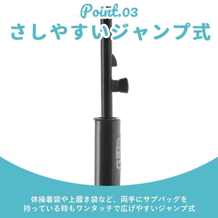 ・体操着袋や上履き袋など、両手にサブバッグを持っている時もワンタッチで広げやすいジャンプ式。