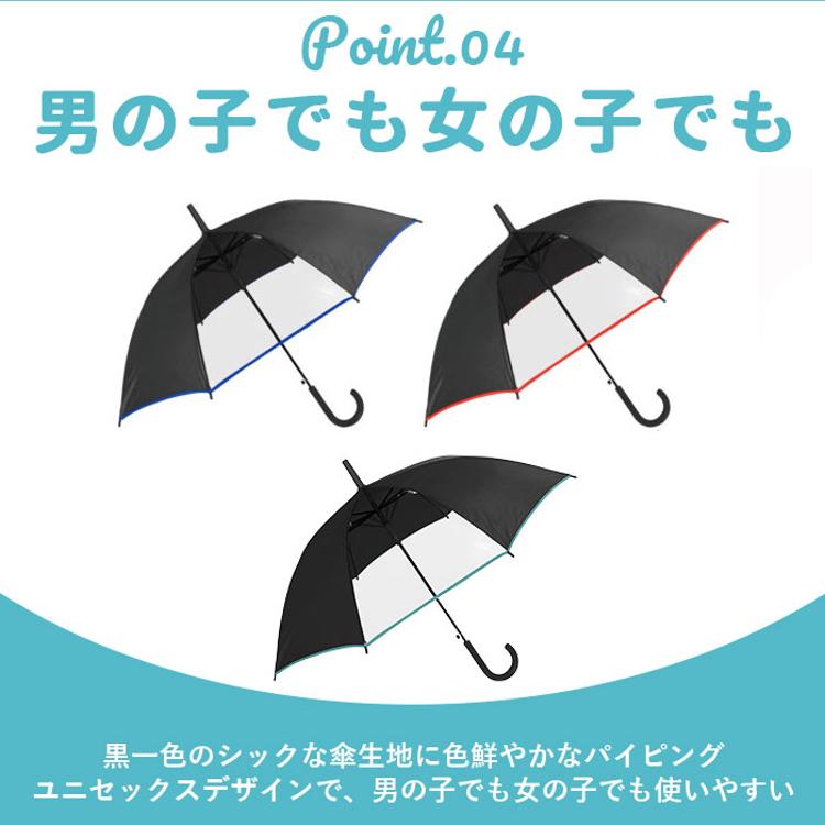 ・黒一色のシックな傘生地に、色鮮やかなパイピングで縁取ったユニセックスデザインなので、男の子でも女の子でも使いやすい♪