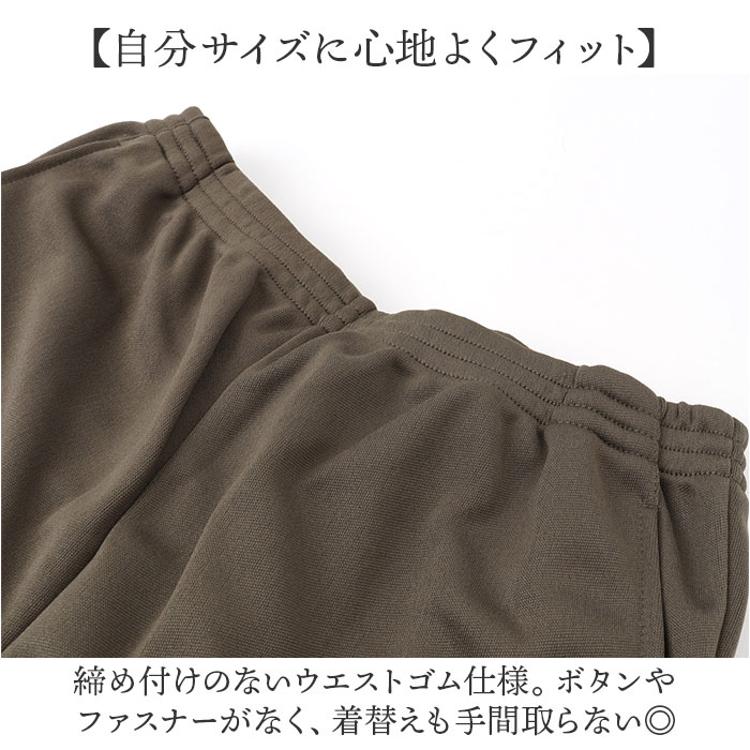 ・締め付けのないウエストゴム仕様。ボタンやファスナーがなく、着替えも手間取らない◎