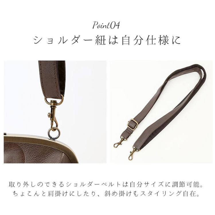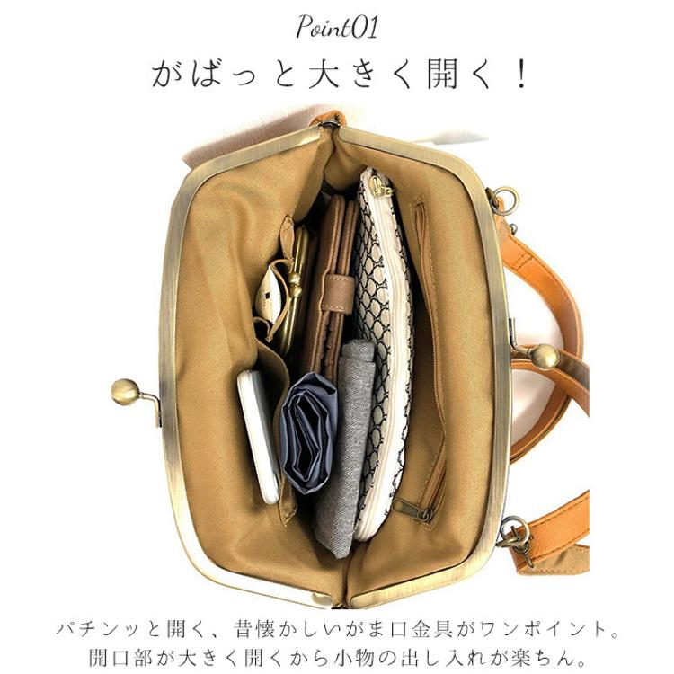 ・パチンッと開く、昔懐かしいがま口金具がワンポイント。開口部が大きく開くから小物の出し入れが楽ちん。