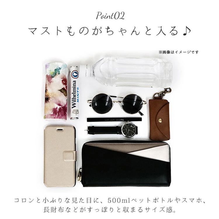 ・コロンと小ぶりな見た目に、500mlペットボトルやスマホ、長財布などがすっぽりと収まるサイズ感。