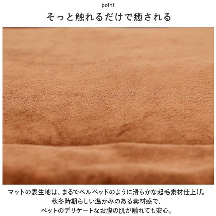 ・マットの表生地は、まるでベルベッドのように滑らかな起毛素材仕上げ。秋冬時期らしい温かみのある素材感で、ペットのデリケートなお腹の肌が触れても安心。