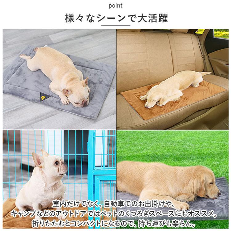・小型~中型のワンちゃんや、ネコちゃんの寝床にちょうどよい61cm×46cmのSサイズ。フロアやソファにそのまま敷いて使えるのはもちろん、ペットゲージやペットベッドの中敷きマットにも最適。お使いのペットヒーターの上に重ねれば、ペットの身体に優しいマイルドな暖かさに。
