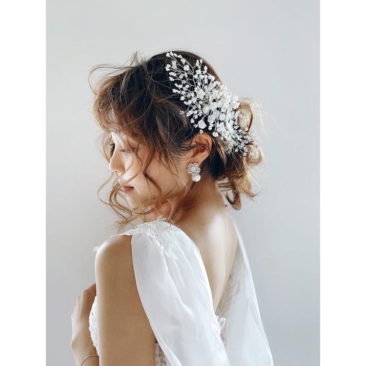 ・耳元で上品に輝くアイテムは、アップスタイルやシニヨンなど、王道のヘアスタイルが似合う。また、フェミニンなデザインなので、ショートカットなどにも。