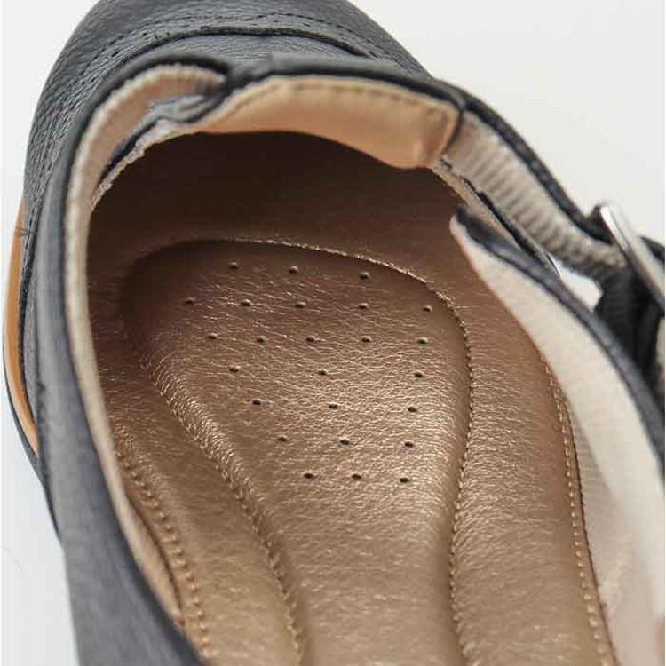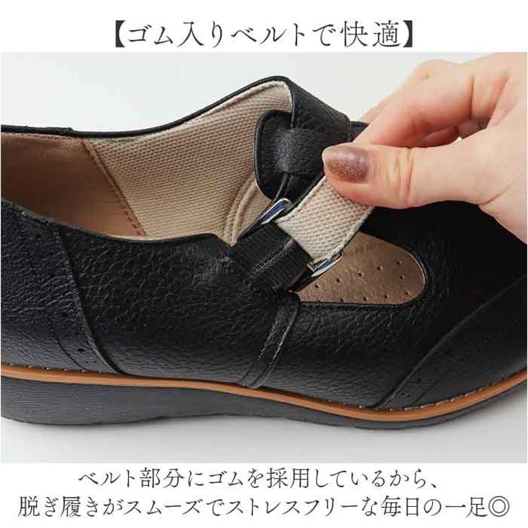 ・ゴム入りベルトで脱ぎ履きラクラク、柔らかインソールで歩きやすいTストラップシューズ。