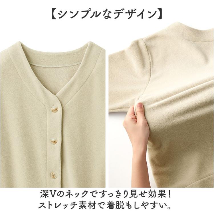 ・深Vのネックですっきり見せ効果!ストレッチ素材で着脱もしやすい。