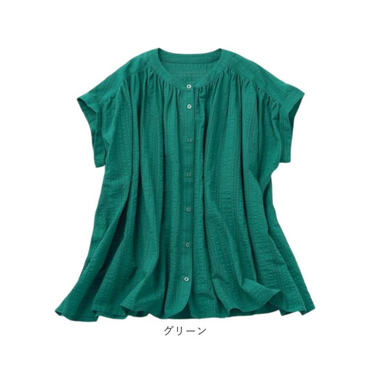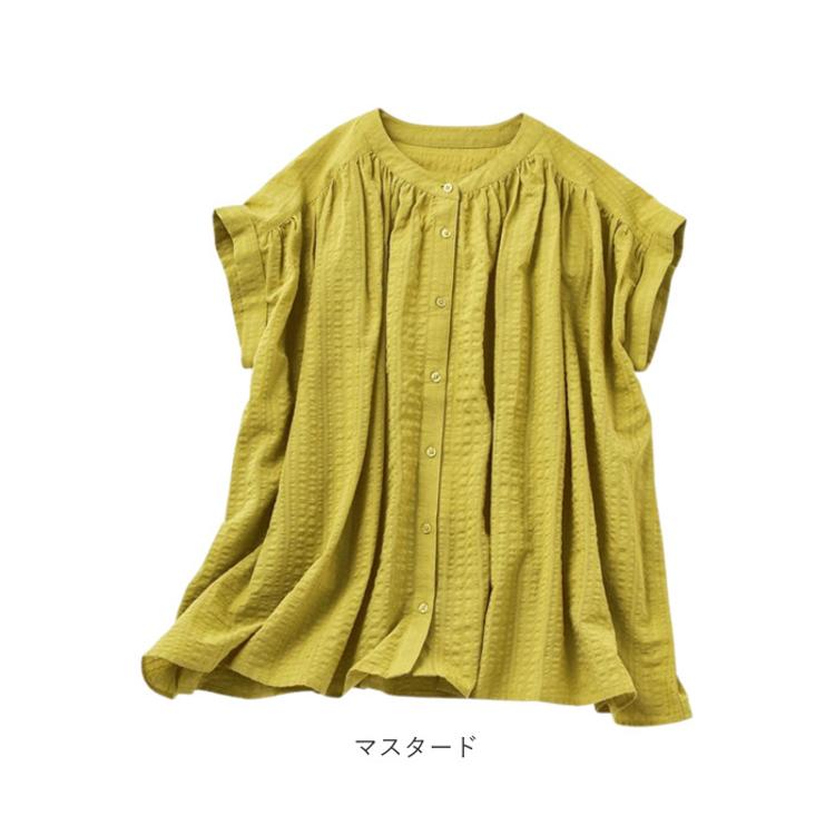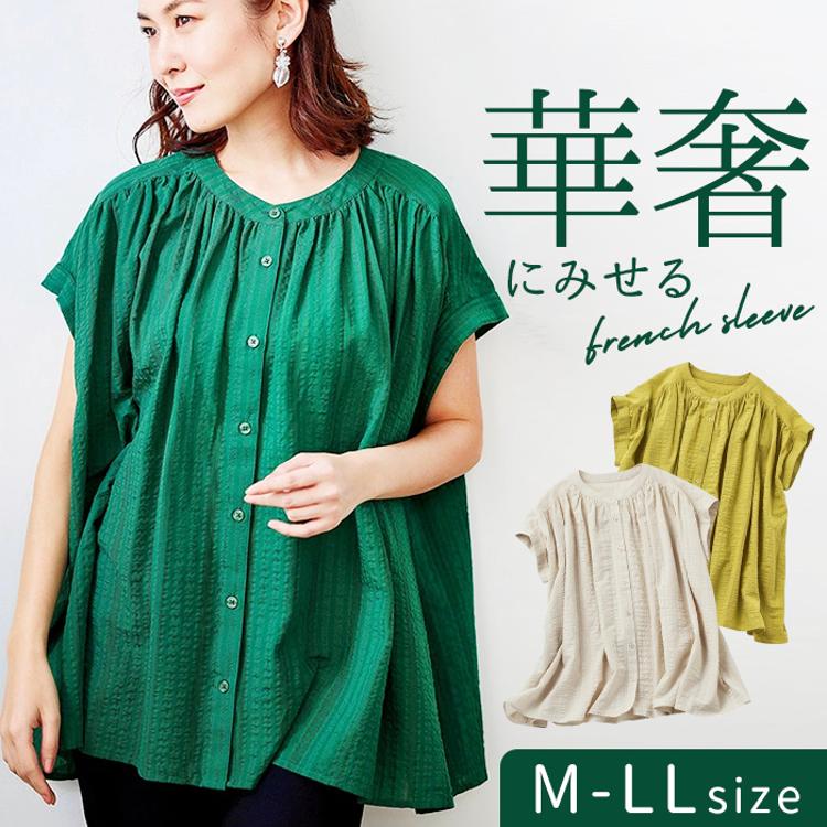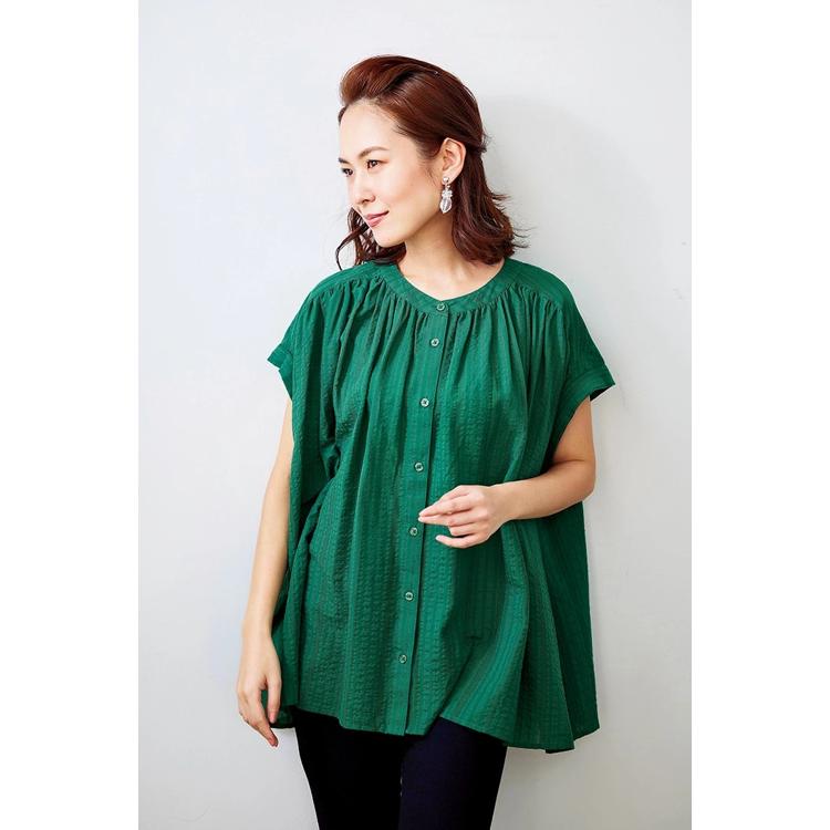 ・バンドカラーとたっぷりギャザーがお洒落に体型カバー。