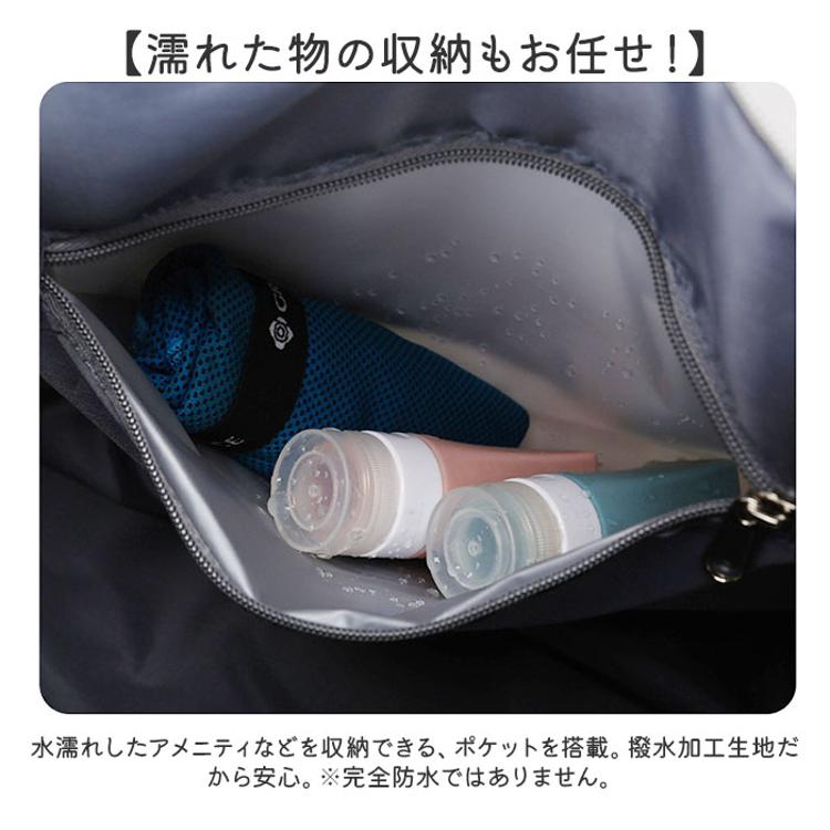 ・水濡れしたアメニティなどを収納できる、ポケットを搭載。撥水加工生地だから安心。